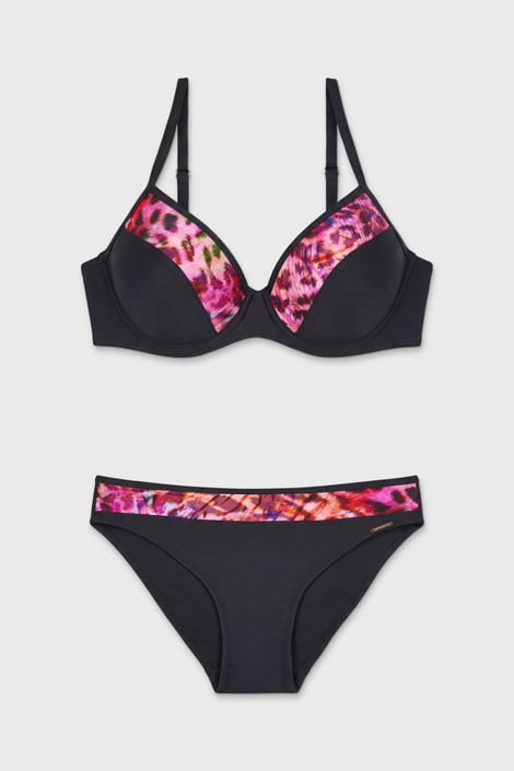 Il costume a due pezzi Clawdia I Push-Up ti regalerà un décolleté naturalmente pieno. Il reggiseno con morbide coppe modella perfettamente il seno e un leggero effetto Push-Up accentua delicatamente la linea del seno. L'elegante nero è completato nella zona del décolleté da una splendida stampa colorata con un sottile accenno di motivo animalier. Completato da uno slip semplice con la sgambatura leggermente alla brasiliana. Il materiale spagnolo e italiano è stato realizzato in modo ecologico da fonti sostenibili. Disegnato dagli stilisti di Astratex.