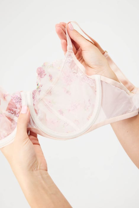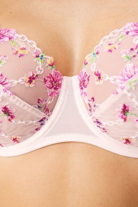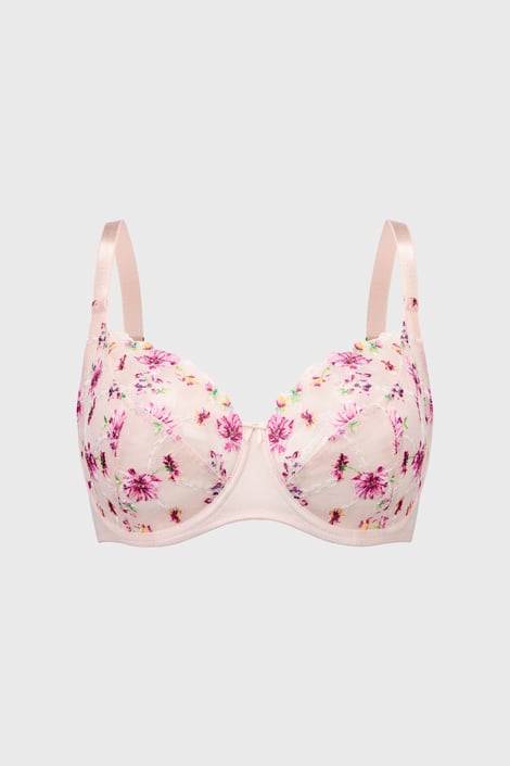 Il reggiseno Floral Fantasy, in una tenue tonalità rosa, è un capo grazioso per le forme piene. Il décolleté è decorato con ricami floreali colorati. Capo disegnato da Astratex.