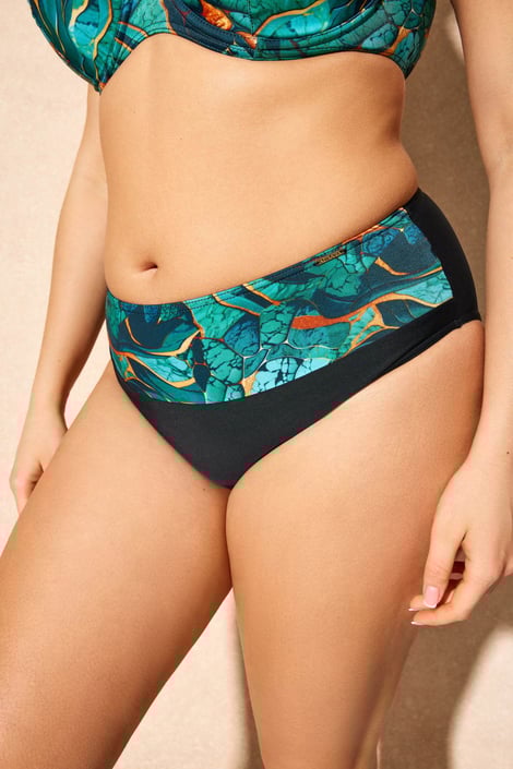 Lo slip bikini Francoise a vita alta nasconde con discrezione le zone problematiche. La vita è decorata con un motivo astratto a contrasto. Capo disegnato da Astratex.