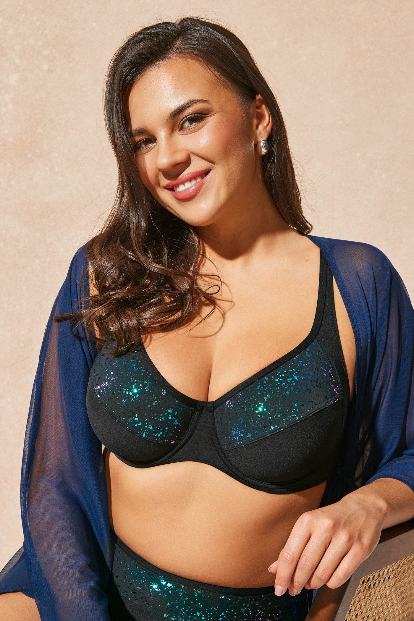 Il top bikini Moonlight in un elegante colore nero è decorato nella zona del décolleté con riflessi scintillanti. Le coppe non imbottite con ferretto donano al seno una forma naturale. Le spalline sono regolabili in lunghezza. Il pregio principale di questa collezione è il materiale italiano di alta qualità, che non è solo resistente e bello, ma anche prodotto in modo ecologico da fonti sostenibili. Disegnato dagli stilisti di Astratex.